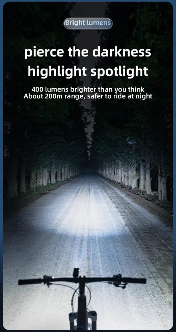 Đèn pha xe đạp siêu sáng Rockbros RHL400LM. Khoảng cách chiếu xa tới 200 mét, góc chiếu gần 110 độ. Đảm bảo tầm nhìn, cũng như vùng bao quát không thể rộng hơn khi đạp xe dưới bóng tối.