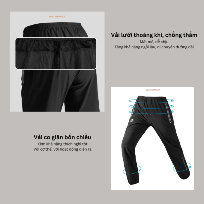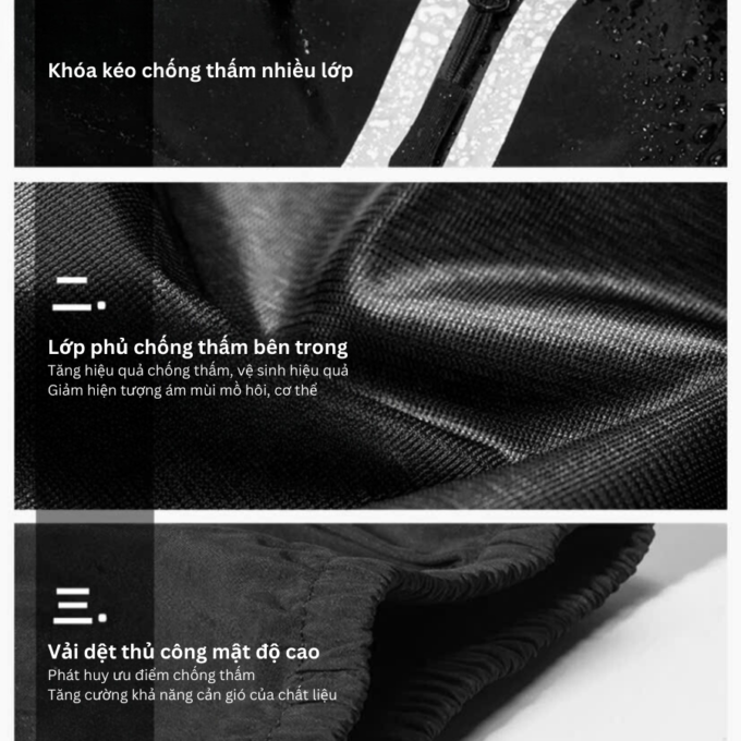 Với khả năng chống thấm, trượt nước hoàn hảo. Sản phẩm hoàn thiện với mức độ sợi dệt có độ dày cao. Mang tới khả năng cản gió rất tốt khi di chuyển đường dài. Hay nhu cầu ứng dụng tập luyện vào những ngày đông lạnh giá với hiệu quả cực kỳ cao.