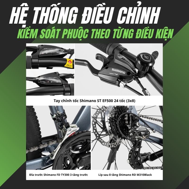 Về  hệ thống truyền động Shimano 24 tốc độ (3 đĩa x 8 líp). Chi tiết chúng ta có: